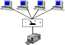 A printer is usually used only in a small part of the day. This is a waste of resources.- Printer share box is a cheaper alternative for printer sharing if that is the only reason to get a network. Such boxes are available in more or less intelligent versions. From the versions where a switch is set on the box according to who is supposed to print, to those that has memory enough to store the tasks from several computers and prints them out according to the time of arrival (first-in-first-out). A share-box system is demonstrated in Figure 2.