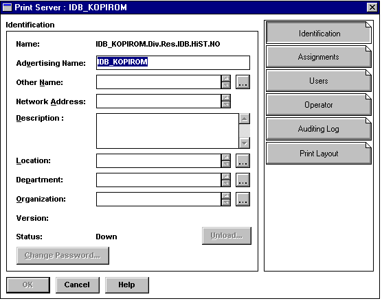 Figure 9 illustrates an example of the printer server object in Novell. This picture is taken from the administration tool NWADMIN. If we choose "Print layout" a tree like the one in figure 12 is revealed.