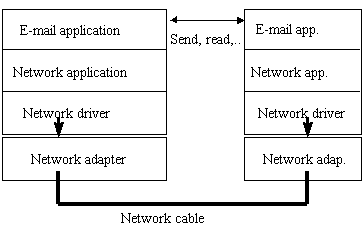 This layering can be illustrated with figure 1. We imagine an e-mail application that has an interface to the user, using buttons for "send" and "read" that are connected to an Internet address. This is a language the user easily understands. It is, off course not possible for the network (the cables) to send such signals. Down on that layer there are only sent electrical signals. The e-mail application is therefore running on top of a network application who are able to translate messages using the correct protocol being used on the network. The network application runs on top of a network driver who send the signals out through a network adapter which passes the signals on to the cable. On the other side the signals will pass on from the cable to the adapter, further up to the driver, and up to the network application that translates the signals to a message, that is read by the e-mail application.