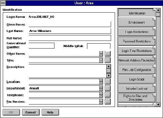 All resources in NDS is called objects. An object can be a user account, a volume, a server, a printer or something entirely different. The object contains information about what it represents (for example the user account). A user account will have information about what the login name is, the users full name, his title, phone number, faxnumber and so on. The fields the user account contains (username and so on) is called the objects attributes while the values a specified object gets is called its values. An example of a part of the NDS user object arne is given in figure 3. We can see that some if the fields are empty. That is because some are mandatory, while others are voluntarily.
