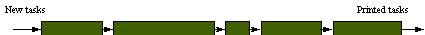 Figure 7 - Smallest job first- Smallest-job-first, but bypassed jobs get an increasing priority. This method is the same as the one above, adding a mechanism that solves the problem of starvation. Each print-task is given a priority number at arrival. This number is proportional with the task size. Each time a task is bypassed, this number is decreased, and eventually the task gets the smallest priority number and is printed.