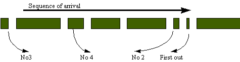 Figure 5 - FIFO- LIFO-queue (Last-In-First-Out) - This one is seldom justified in a printing environment. It random who is the last one in and those who arrived early into the queue might get stuck if there are a lot of traffic.