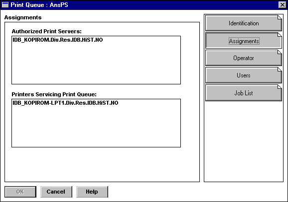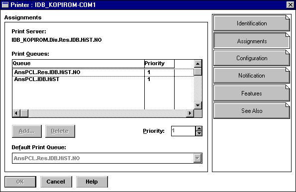 Figure 10 demonstrates an example of a printer object from NWADMIN. In the field "Assignments" the most important configuration is done, this is where printer objects are connected to the queues.