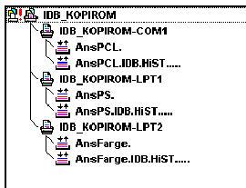 Figure 12 - Print layoutFigure 12 shows us how the connection between the different printer objects are defined in one case here at the Computing Department (IDB). At the top left corner we can see a Printer server, IDB_KOPIROM. From this server there branches out several printers, among those IDB_KOPIROM-COM1. To each of the printers there are connected two queues. It is possible to connect more queues to each printer.