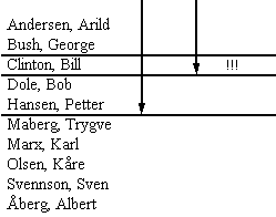 If we want to sort a list over persons and find the name "Bill Clinton" in the sorted list, we will use the method outlined in figure 2. The list is first sorted, and thereafter split in half. Next we check to see if the name is localised in the upper or lower half. In our case the name is localised in the upper half. The upper half is divide into two and we search the list again to see if the name is in the upper or lower half of the upper half. We still find the name in the upper half, Which is divided into two giving two names in the upper half and one in the lower half. And the name in the lower half seems to be the one we were searching for. For a computer this is an efficient way to search.