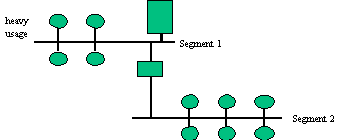 - Moving or balancing components. We can imagine a network that, to make it simple, consists of two segments (Figure 3). One segment is heavily used, and a bottleneck and the other segment are relatively all right. These measures are made with a tool for system tuning. Solutions to this might be to move components over from the more used over to the less used segment. This makes segment 2 more used, we have just balanced the network. We can just hope that segment 2 don't become the new bottleneck.
