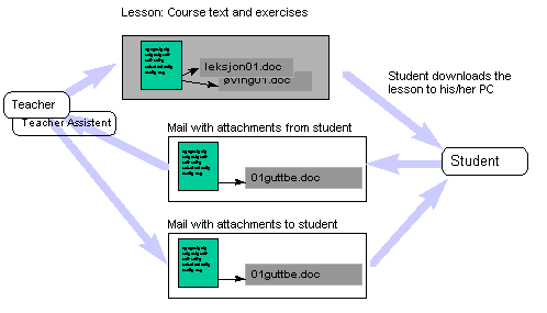 The figure below shows the main features of the lesson cycle. It starts with the distribution of a lesson comprising the course text and exercises. The student completes the lesson and works on the exercises, producing answers to be sent to the supervisory teacher.