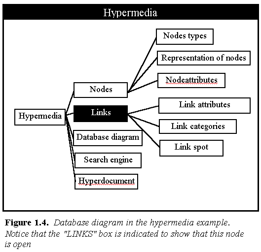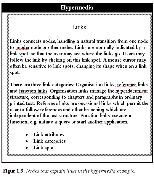 Organisation links handle the structure of the hyperdocument, analogous to chapters and paragraphs in an ordinary printed text. Reference links are occasional references to other material, e.g. bibliography references and footnotes. How links are indicated normally varies from system to system. In the example above reference links are indicated using a little circle in front of the link word, and the link words of the reference links are underlined.