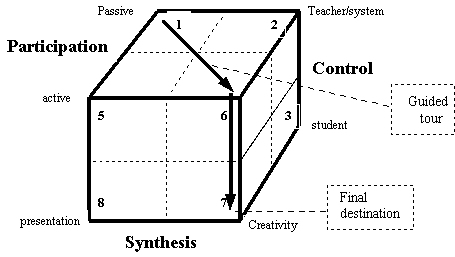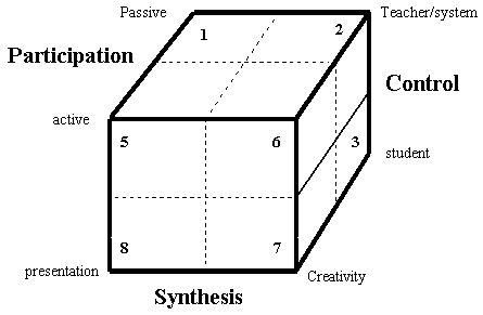 The issue has been rendered as a cube placed in a three-dimensional axis system. One axis is called Synthesis, its extremes being presentation and creativity, the second is called Control and its extremes are student and teacher/system, and the third axis we call Participation with its extremes active and passive. The cube is furthermore divided into smaller cubes numbered 1 to 8.