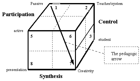 The issue has been rendered as a cube placed in a three-dimensional axis system. One axis is called Synthesis, its extremes being presentation and creativity, the second is called Control and its extremes are student and teacher/system, and the third axis we call Participation with its extremes active and passive. The cube is furthermore divided into smaller cubes numbered 1 to 8.