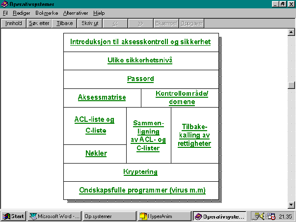 Figure 5.5 Example of a composite node with table structure. The example is from course IT222: Operating systems at IFI, NTNU. The screen copy quality is poor, unfortunately. All the underlined words/terms are anchor points for further branches to be selected.